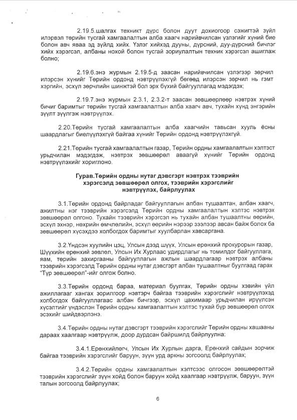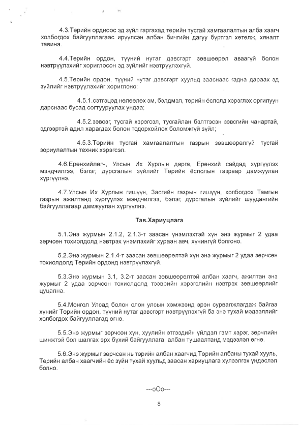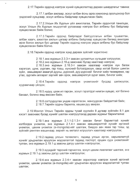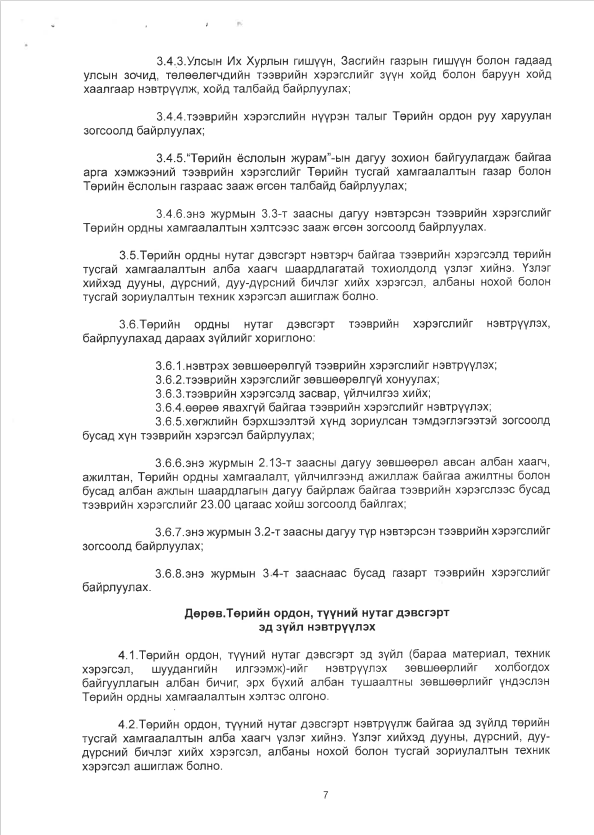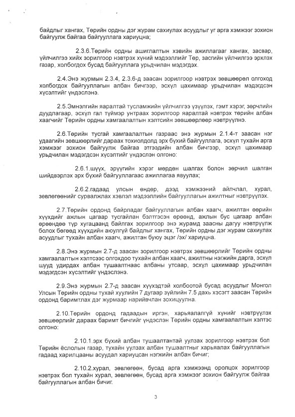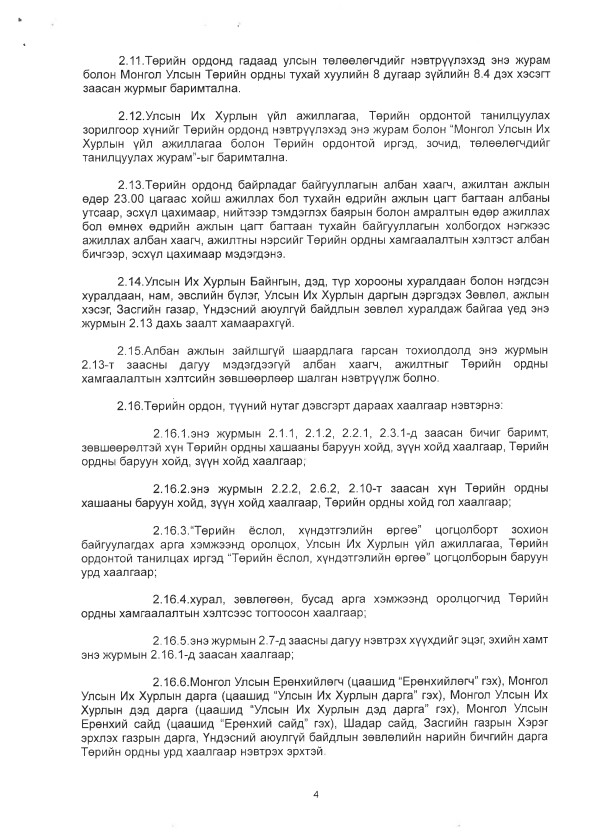 Монгол лсын Төрийн ордны тухай хуулийн 7 дугаар зүйлийн 7.5 дахь хэсэгт “Төрийн ордонд нэвтрэх тусгай журам болон Төрийн ордонд баримтлах дэг журмыг Монгол Улсын Их Хурлын Тамгын газар, Ерөнхийлөгчийн Тамгын газар, Засгийн газрын Хэрэг эрхлэх газар, төрийн тусгай хамгаалалтын байгууллага хамтран батална.” гэж заасны дагуу Төрийн ордны халдашгүй дархан байдлыг хангах, Төрийн ордонд байрладаг байгууллага үйл ажиллагаа хэвийн явуулах нөхцөлийг бүрдүүлэх зорилгоор Төрийн ордон, түүний нутаг дэвсгэрт хүн, тээврийн хэрэгсэл, эд зүйл нэвтрүүлэх харилцааг зохицуулах “Монгол Улсын Төрийн ордонд нэвтрэх тусгай журам”-ыг эрх бүхий байгууллагууд хамтран баталлаа.